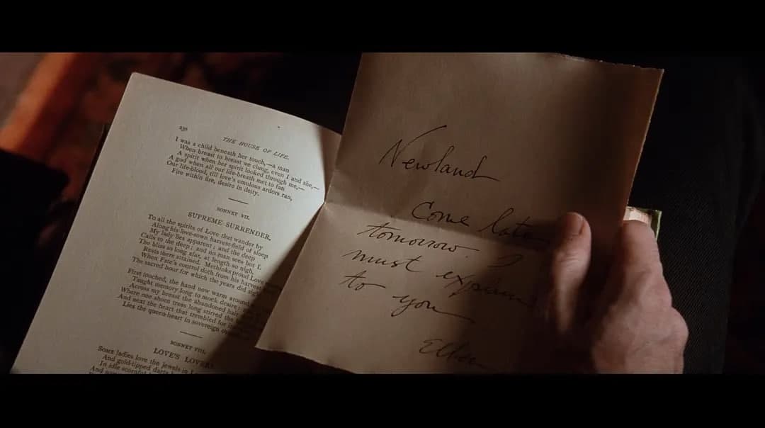 我年少的时候开始喜欢读诗,对诗歌比较敏感。所以镜头里出现“Supreme Surrender”这首诗的时候给我的感受还是挺惊艳的。N和E在小木屋里发生了点误会,N以为E是在期待另一个男人B,略带自嘲的愤愤离开。E当天给他写了封信:“Newland,come late tomorrow,I must explain to you.” N读这封信的时候,正好放在一本翻开的诗集中间,看完内心很慌乱,于是把纸条攒成一团(然后第二天就心神不宁去找M催婚了)。于是有了下面这个镜头。